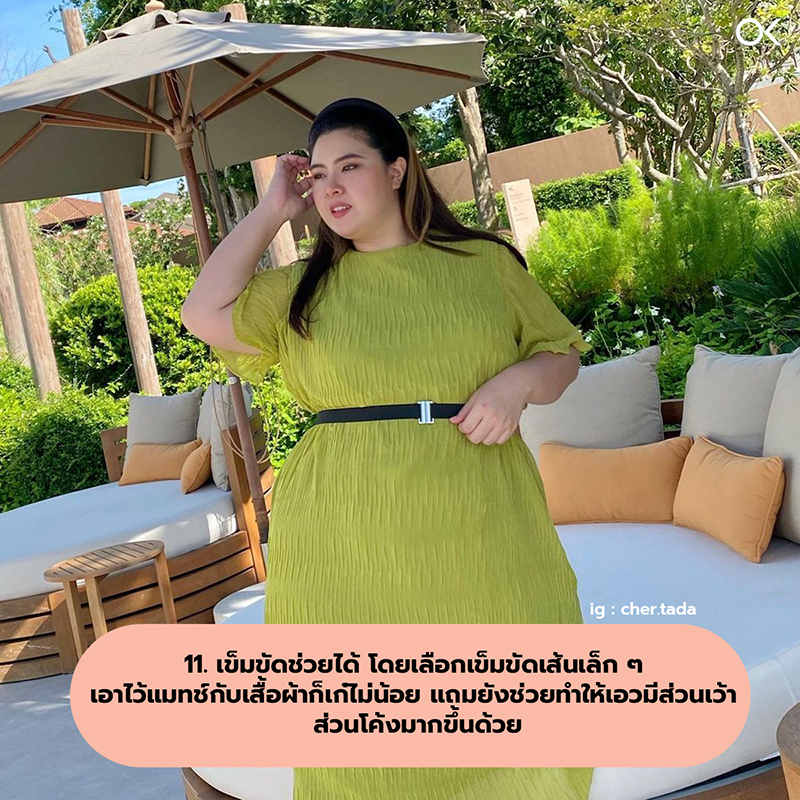 - เข็มขัดช่วยได้ โดยเลือกเข็มขัดเส้นเล็ก ๆ เอาไว้แมทช์กับเสื้อผ้าก็เก๋ไม่น้อย แถมยังช่วยทำให้เอวมีส่วนเว้า ส่วนโค้งมากขึ้นด้วย