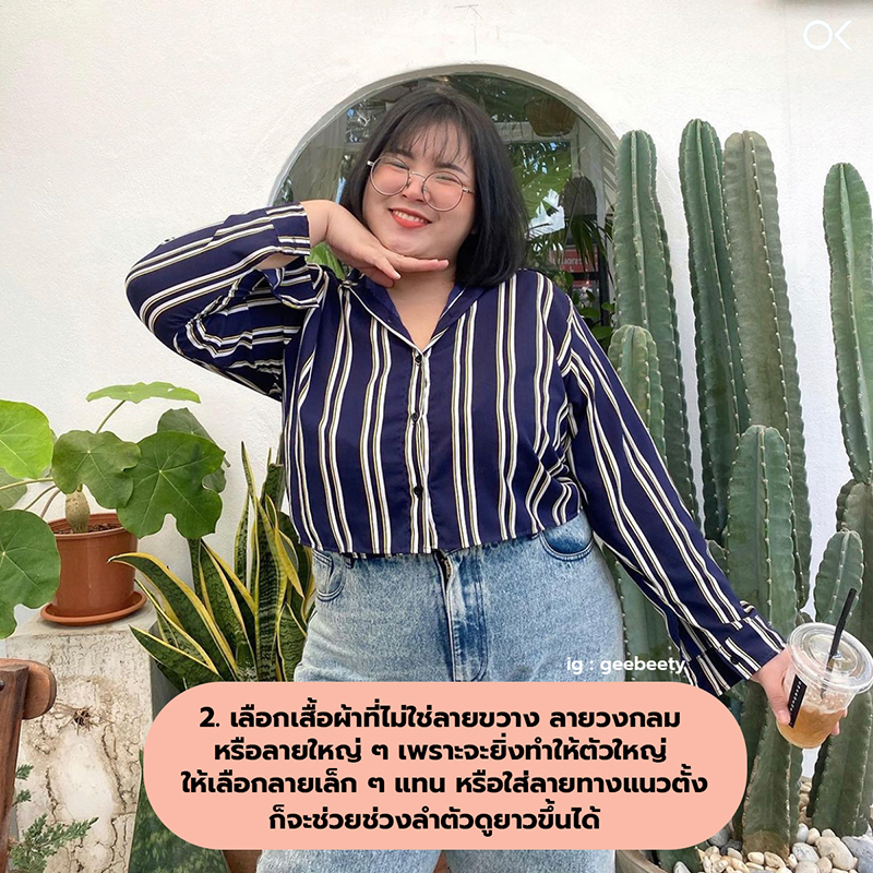 - เลือกเสื้อผ้าที่ไม่ใช่ลายขวาง ลายวงกลม หรือลายใหญ่ ๆ เพราะจะยิ่งทำให้ตัวใหญ่ ให้เลือกลายเล็ก ๆ แทน หรือใส่ลายทางแนวตั้งก็จะช่วยช่วงลำตัวดูยาวขึ้นได้