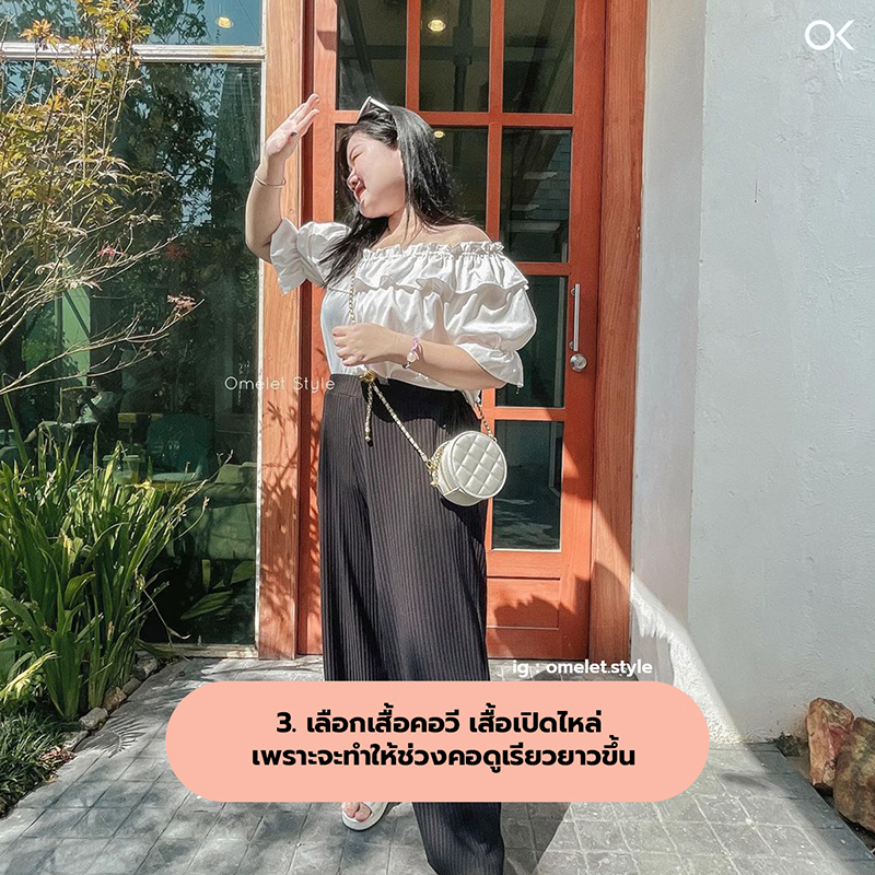 - เลือกเสื้อคอวี เสื้อเปิดไหล่ เพราะจะทำให้ช่วงคอดูเรียวยาวขึ้น