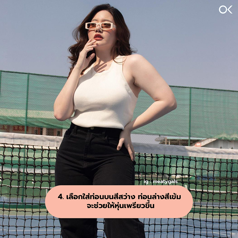 - เลือกใส่ท่อนบนสีสว่าง ท่อนล่างสีเข้ม จะช่วยให้หุ่นเพรียวขึ้น