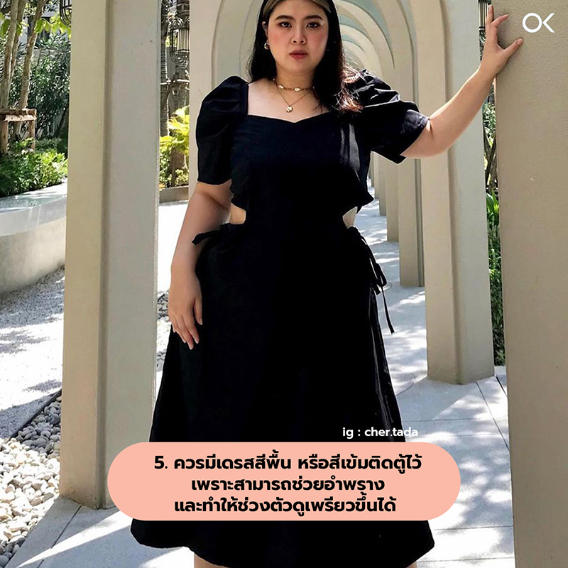 - ควรมีเดรสสีพื้น หรือสีเข้มติดตู้ไว้ เพราะสามารถช่วยอำพรางและทำให้ช่วงตัวดูเพรียวขึ้นได้