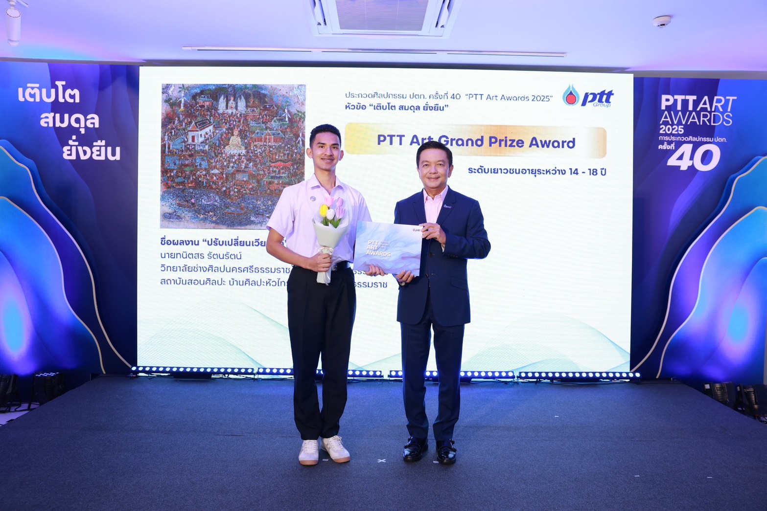 8 ต.ค. 2568 00:00นายคงกระพัน อินทรแจ้ง ประธานเจ้าหน้าที่บริหารและกรรมการผู้จัดการใหญ่ บริษัท ปตท.จำกัด (มหาชน) (ปตท.) เป็นประธานในพิธีมอบรางวัลแก่ผู้ชนะการประกวดศิลปกรรม ปตท. ครั้งที่ 40 “PTT Art Awards” จำนวน 40 รางวัล จากการคัดเลือกและตัดสินโดยคณะกรรมการผู้ทรงคุณวุฒิด้านศิลปะในแขนงต่างๆ ซึ่งในปีนี้ มีศิลปินสนใจร่วมส่งผลงานเข้าประกวดในประเภทจิตรกรรม ประติมากรรม ภาพพิมพ์ สื่อผสม ดิจิทัลอาร์ต 2 มิติ และทัศนศิลป์อื่นๆ รวมกันจำนวนมากกว่า 900 ชิ้น