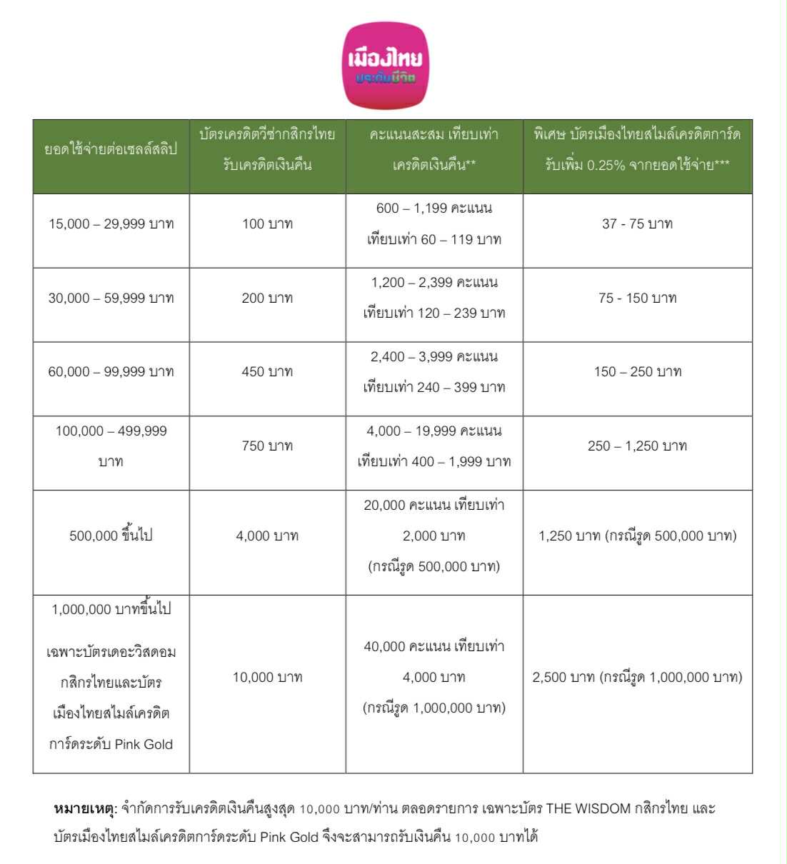 พิเศษ เฉพาะผู้ถือบัตรเมืองไทยสไมล์เครดิตการ์ด รับเครดิตเงินคืน 0.25% จากยอดชำระเบี้ยประกันภัย แบบไม่จำกัดวงเงิน พร้อมรับเครดิตเงินคืนตามยอดใช้จ่ายต่อเซลล์สลิป ดังนี้