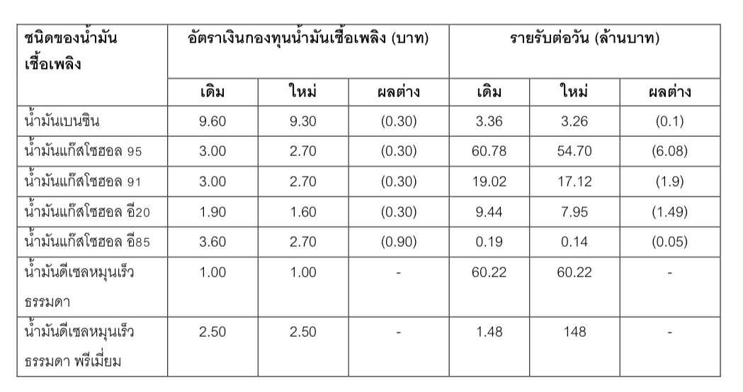 นอกจากนี้ ยังมีการปรับลดราคาขายปลีกน้ำมันเบนซินลงทุกชนิด 30 สตางค์/ลิตร เพื่อให้ประชาชนได้รับประโยชน์โดยตรงจากการบริหารจัดการราคาพลังงานอย่างทันท่วงที ภายใต้หลักการทำงาน “เปิดเผย-โปร่งใส-ตรวจสอบได้” ของ กบน. และสำนักงานกองทุนน้ำมันเชื้อเพลิง (สกนช.) โดยมีรายละเอียดในตาราง ดังนี้