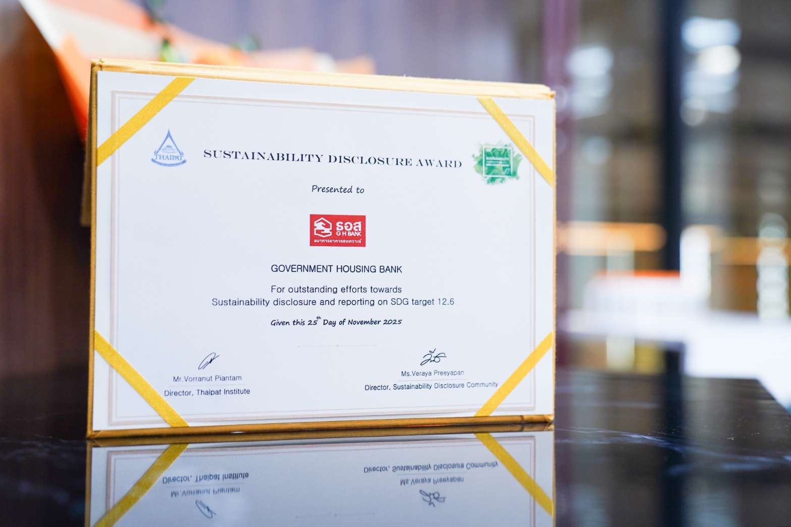 ธอส. ได้รับรางวัลเกียรติคุณ Sustainability Disclosure Award เป็นปีที่ 5 ติดต่อกัน โดยเป็นรางวัลสูงสุดที่มอบให้แก่องค์กรที่เปิดเผยข้อมูลการดำเนินงานด้านการพัฒนาความยั่งยืนที่เป็นไปตามมาตรฐานสากล ครอบคลุมการดำเนินงานในมิติด้านสิ่งแวดล้อม สังคม และการกำกับดูแลกิจการที่ดี โดยพิจารณาจากหลักเกณฑ์ 3 ด้าน ประกอบด้วย 1. ความสมบูรณ์ของเนื้อหา 2. ความเชื่อถือได้ของเนื้อหา และ 3. การสื่อสารและนำเสนอเนื้อหาของข้อมูลที่เปิดเผยต่อสาธารณะ โดย ธอส.ได้รวบรวมข้อมูลผลการดำเนินงานที่สอดคล้องกับมาตรฐานสากล GRI Standards (Global Reporting Initiative Standards) และเปิดเผยข้อมูลผลการดำเนินงานด้านการพัฒนาความยั่งยืนผ่านการจัดทำรายงานการพัฒนาความยั่งยืนประจำปี 2567 สะท้อนการเป็นองค์กรที่มีการเปิดเผยข้อมูลการดำเนินงานที่เป็นมาตรฐานสากล นำไปสู่การพัฒนาองค์กรเพื่อความยั่งยืน