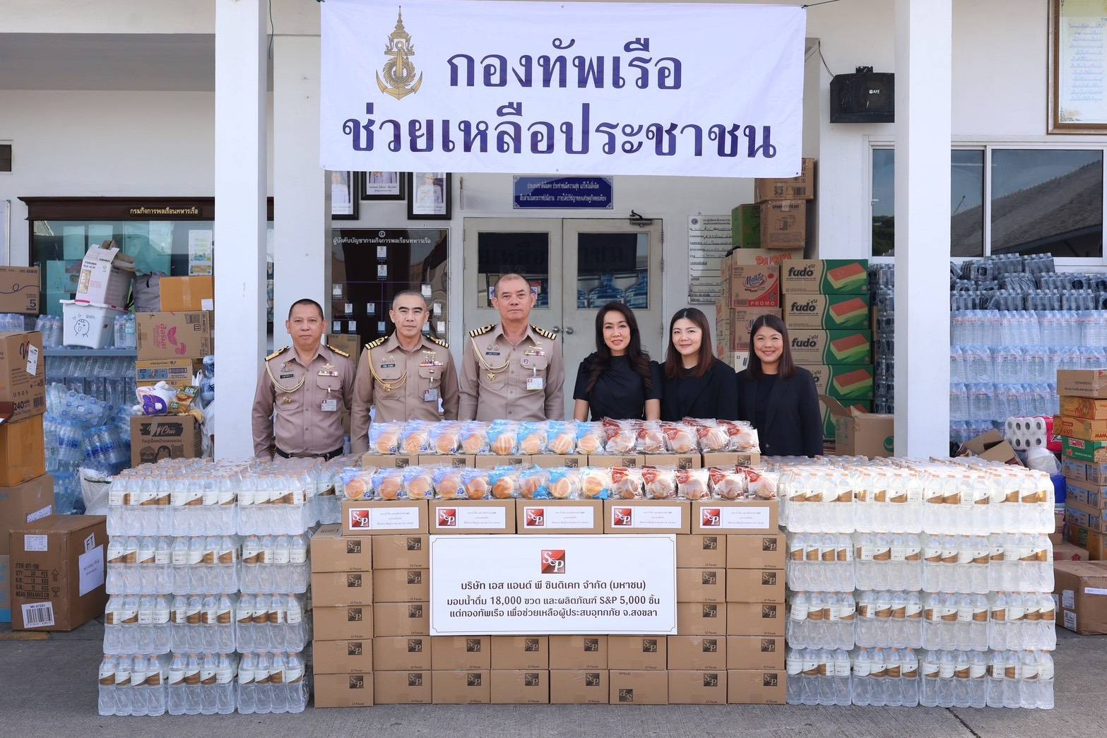 นางมณีสุดา ศิลาอ่อน ประธานเจ้าหน้าที่สำนักพัฒนาความยั่งยืนและสื่อสารองค์กร บริษัท เอส แอนด์ พี ซินดิเคท จำกัด (มหาชน) มอบน้ำดื่ม จำนวน 18,000 ขวด และผลิตภัณฑ์ขนมปังเดลิโอ S&P จำนวน 5,004 ชิ้น มูลค่ารวม 400,104 บาท เพื่อช่วยบรรเทาความเดือดร้อนของประชาชนผู้ประสบอุทกภัยพื้นที่จังหวัดสงขลา และจังหวัดใกล้เคียง ภายใต้โครงการ “S&P รวมใจช่วยภัยน้ำท่วม ปี 2568” โดยมี พลเรือเอก ไพโรจน์ เฟื่องจันทร์ ผู้บัญชาการทหารเรือ ให้เกียรติรับมอบ ณ กองบัญชาการทหารเรือ ระหว่างวันที่ 27 - 28 พฤศจิกายน 2568