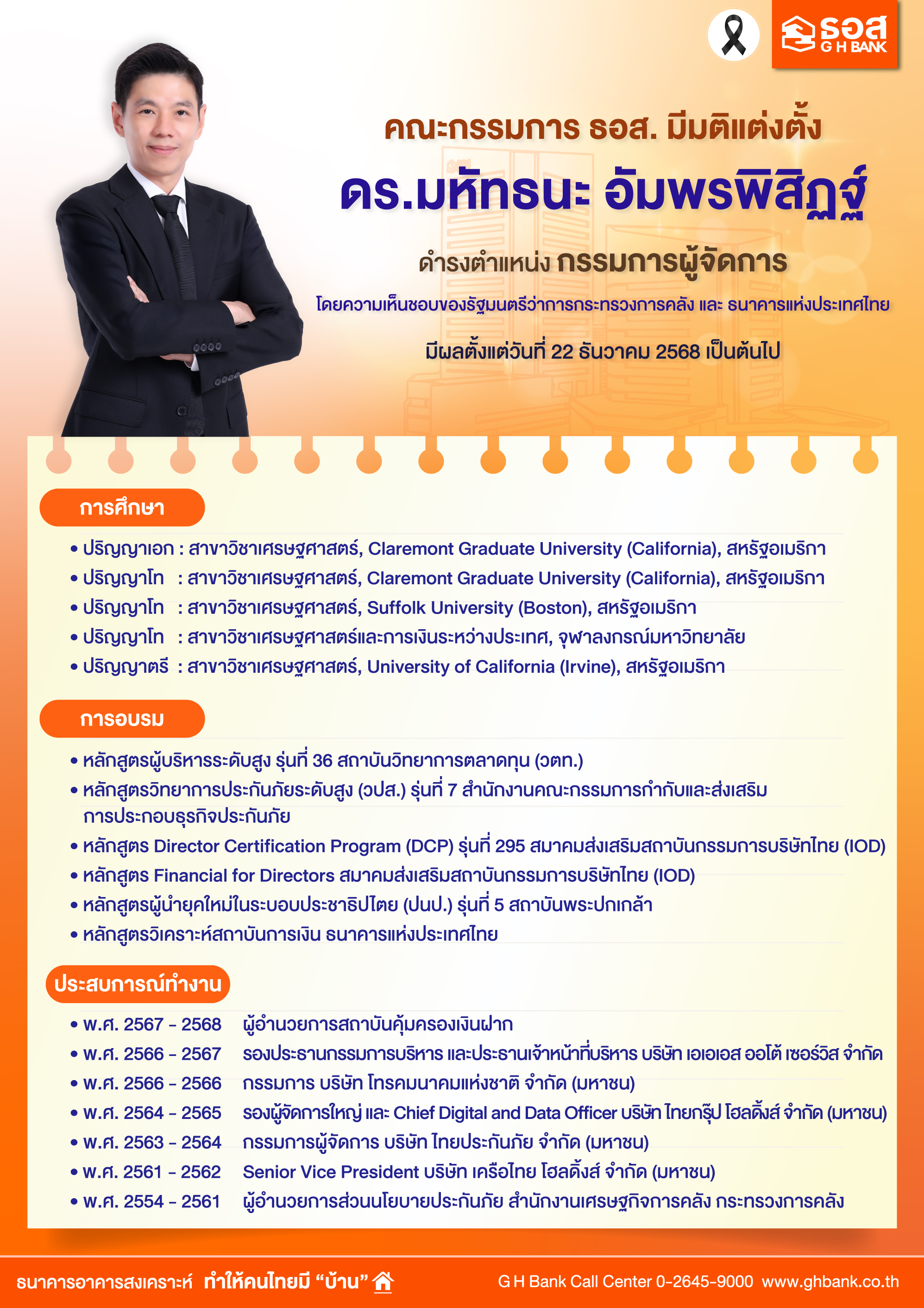 บอร์ด ธอส. มีมติแต่งตั้ง “มหัทธนะ อัมพรพิสิฏฐ์” นั่งกรรมการผู้จัดการ เริ่มงาน 22 ธ.ค. 68