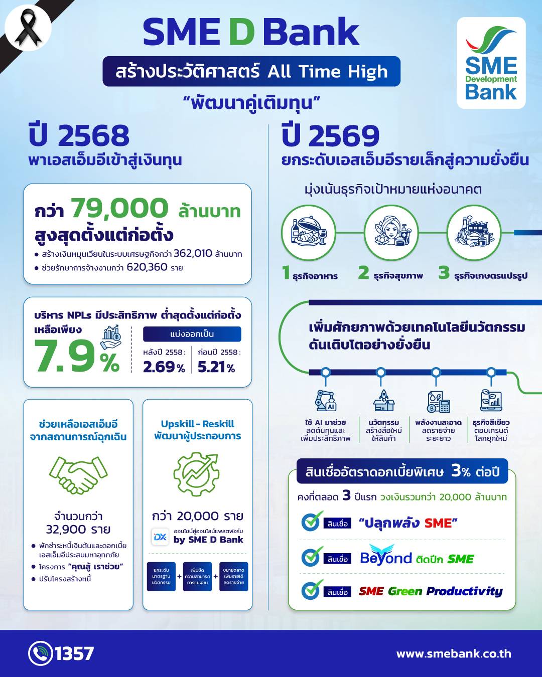 "ผลการดำเนินงานของ SME D Bank ในปี 2568 ถือว่าสร้างสถิติใหม่ พาเอสเอ็มอีเข้าถึงแหล่งทุนรวมกว่า 79,043 ล้านบาท ถือเป็นยอดสูงที่สุดนับตั้งแต่ก่อตั้งธนาคารมากว่า 23 ปี โดยสอดคล้องเป็นไปตามพันธกิจของธนาคารที่มุ่งเน้นสนับสนุนผู้ประกอบการรายใหม่และขนาดเล็ก วงเงินกู้สูงสุดไม่เกิน 15 ล้านบาท สูงถึงกว่า 70% ของการเติมทุนทั้งหมดช่วยสร้างประโยชน์ก่อให้เกิดเงินหมุนเวียนในระบบเศรษฐกิจไทยกว่า 362,010 ล้านบาท รักษาการจ้างงานประมาณ 620,360 ราย สวนทางกับแนวโน้มสินเชื่อธุรกิจเอสเอ็มอีในระบบ ที่ติดลบต่อเนื่องมา 13 ไตรมาส"