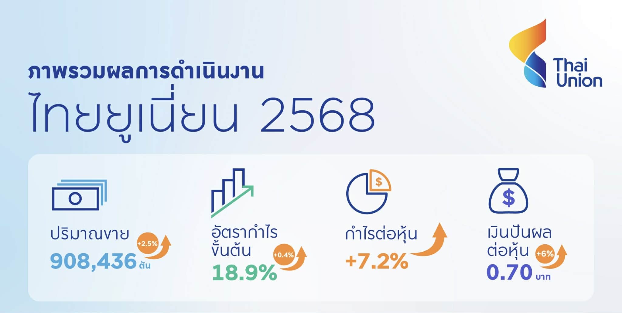 บริษัท ไทยยูเนี่ยน กรุ๊ป จำกัด (มหาชน) หรือ TU รายงานผลประกอบการปี 2568 ด้วยยอดขายรวม 132,719 ล้านบาท และปริมาณการขาย 908,436 แสนตัน เพิ่มขึ้น 2.5% จากปีก่อน เป็นผลจากการเติบโตของกลุ่มผลิตภัณฑ์อาหารทะเลแปรรูป อาหารทะเลแช่แข็ง และอาหารสัตว์เลี้ยง ขณะที่อัตรากำไรขั้นต้นขยายตัวทะลุ 18.9 % สูงสุดเป็นประวัติการณ์ สะท้อนความสามารถในการบริหารจัดการที่มีประสิทธิภาพและการปรับตัวอย่างรวดเร็ว โดยได้รับปัจจัยหนุนจากกลุ่มผลิตภัณฑ์อาหารทะเลแช่แข็งที่ดีขึ้นต่อเนื่อง ส่งผลให้กำไรจากการดำเนินงานตามที่ปรับปรุง โดยไม่รวม transformation cost อยู่ที่ 6,998 ล้านบาท