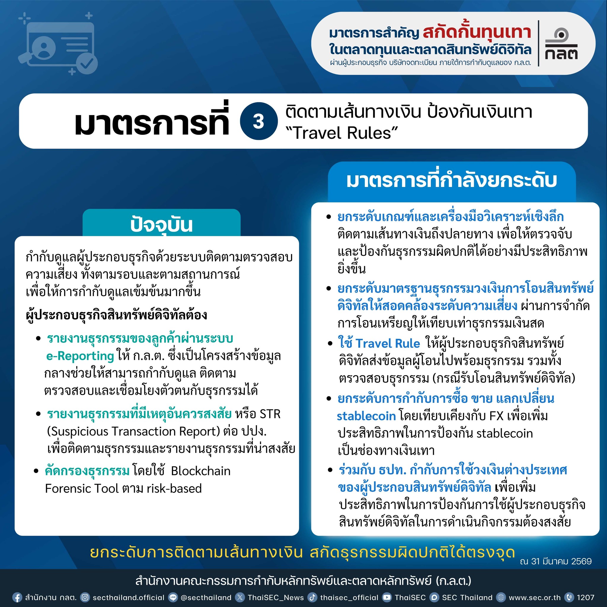 โดยมีแนวทาง ดังนี้ 1) ยกระดับเครื่องมือวิเคราะห์เชิงลึก เพื่อติดตามเส้นทางเงินได้ถึงปลายทาง เพิ่มประสิทธิภาพในการตรวจจับและป้องกันธุรกรรมผิดปกติ 2) ยกระดับมาตรฐานธุรกรรมการโอนสินทรัพย์ดิจิทัลให้สอดคล้องความเสี่ยง โดยให้เทียบเคียงธุรกรรมเงินสด 3) การใช้ Travel Rule โดยให้ผู้ประกอบธุรกิจสินทรัพย์ดิจิทัลจัดส่งข้อมูลผู้โอนไปพร้อมธุรกรรมการโอนสินทรัพย์ดิจิทัล และตรวจสอบข้อมูลในกรณีรับโอนสินทรัพย์ดิจิทัล 4) การกำกับดูแลการซื้อขายและแลกเปลี่ยนstablecoin ให้เทียบเคียงธุรกรรมเงินตราต่างประเทศ (FX) เพื่อป้องกันการใช้เป็นช่องทางของเงินเทา และ 5) ร่วมมือกับธนาคารแห่งประเทศไทย ในการกำกับดูแลการใช้วงเงินต่างประเทศ เพื่อเพิ่มประสิทธิภาพในการป้องกันและสกัดธุรกรรมที่มีความเสี่ยงในตลาดสินทรัพย์ดิจิทัล