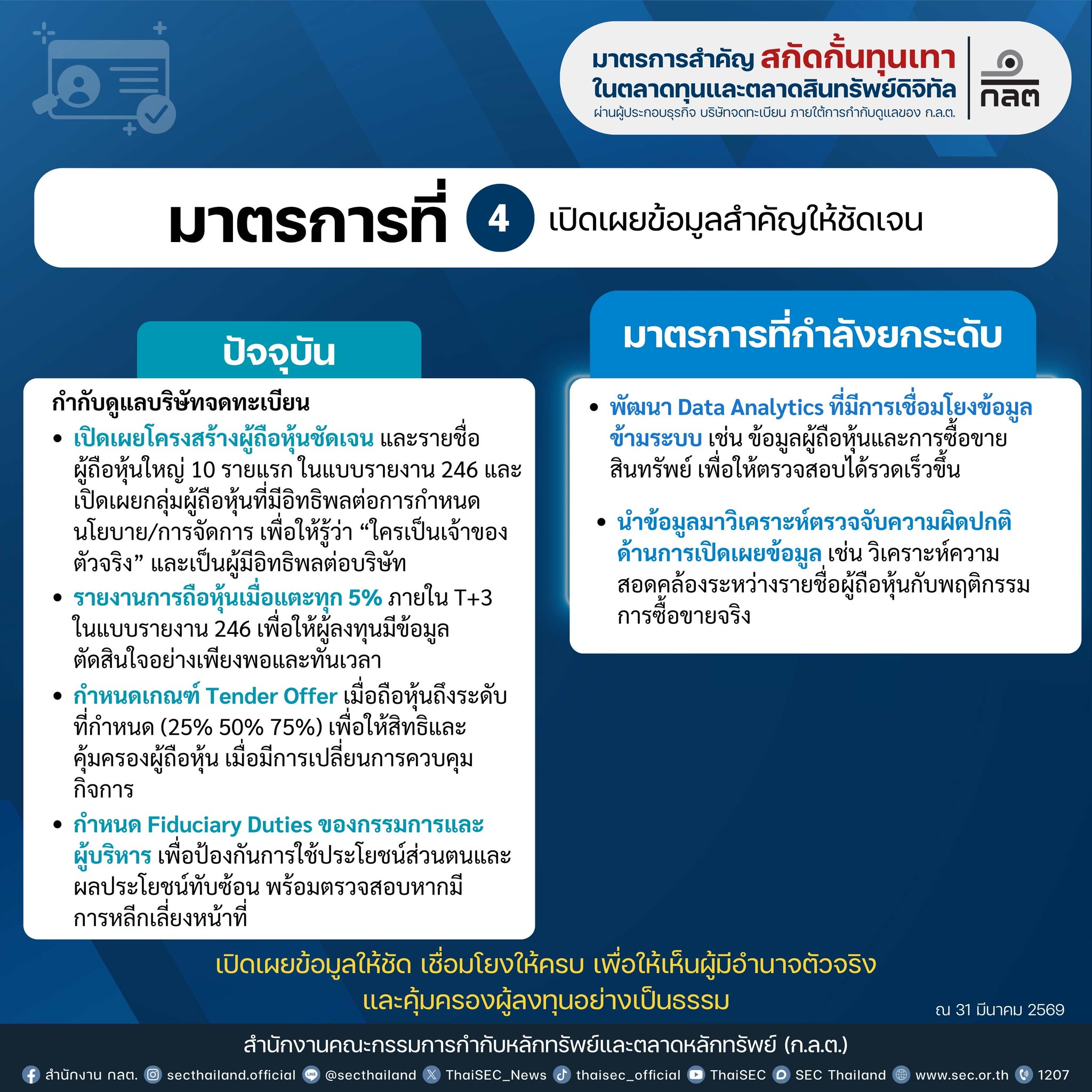 โดย ก.ล.ต. จะพัฒนา Data Analytics ที่มีการเชื่อมโยงข้อมูลข้ามระบบ และนำข้อมูลมาวิเคราะห์เพื่อตรวจจับความผิดปกติ เช่น ความไม่สอดคล้องระหว่างรายชื่อผู้ถือหุ้นกับพฤติกรรมการซื้อขายจริง ข้อมูลผู้ถือหุ้นและการซื้อขายสินทรัพย์
