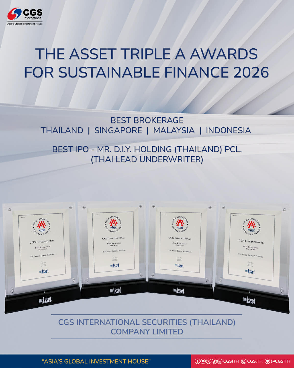 บริษัทหลักทรัพย์ ซีจีเอส อินเตอร์เนชั่นแนล (ประเทศไทย) จำกัด หรือ CGSIคว้ารางวัล Best Brokerage ทั้งในประเทศไทย และในภูมิภาค รวมทั้งรางวัล Best IPO ในประเทศไทย จาก The Asset Triple A Awards for Sustainable Finance 2026 จัดโดย The Asset Magazine นิตยสารการเงินชั้นนำของเอเชีย