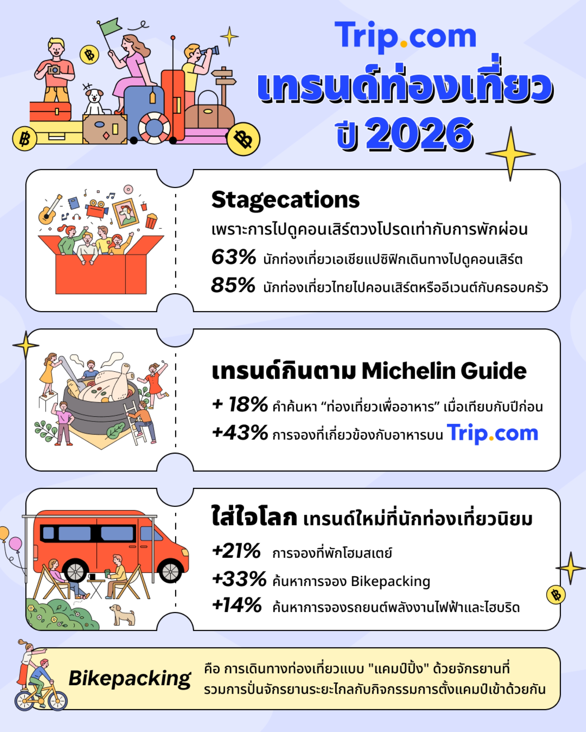 • "Stagecations" กำลังได้รับความนิยมในกลุ่มครอบครัว : Stagecation หรือการการท่องเที่ยวเพื่อชมความบันเทิงสดกำลังได้รับความนิยมเพิ่มขึ้น ปัจจุบันนักเดินทางในภูมิภาคเอเชียแปซิฟิกกว่า 63% เดินทางเพื่อชมคอนเสิร์ตหรือ่วมงานอีเวนต์ ขณะที่นักท่องเที่ยวชาวไทยถึง 85% มักผสมผสานทริปคอนเสิร์ตหรือเทศกาลเข้ากับการท่องเที่ยวพักผ่อนของครอบครัว โดยมีเมืองศูนย์กลางยอดนิยมอย่างมาเก๊า ลาสเวกัส เมลเบิร์น และสิงคโปร์เป็นจุดหมายหลัก