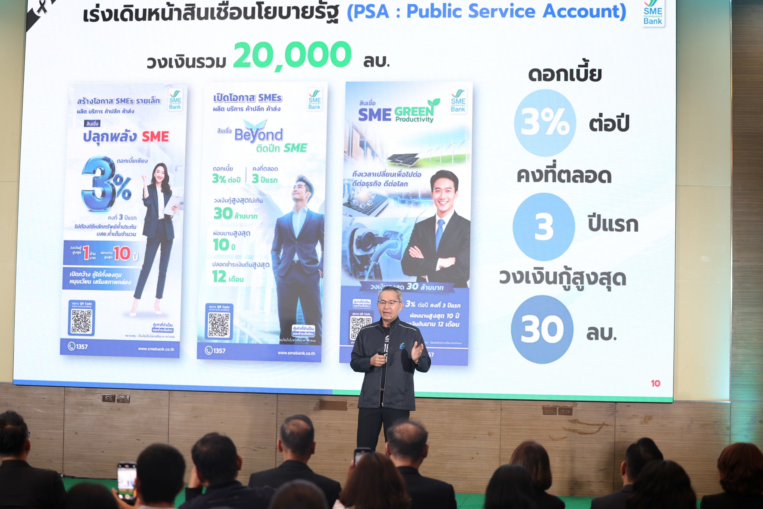 โดย 3 ผลิตภัณฑ์สินเชื่อ ประกอบด้วย โครงการ “สินเชื่อ ปลุกพลัง SME” สร้างโอกาสให้ผู้ประกอบการรายเล็กเข้าถึงแหล่งทุน วงเงินกู้สูงสุดไม่เกิน 1 ล้านบาท ไม่ต้องใช้หลักทรัพย์ค้ำประกัน, โครงการ “สินเชื่อ Beyond ติดปีก SME” มุ่งเพิ่มศักยภาพยกระดับธุรกิจ วงเงินกู้สูงสุดไม่เกิน 30 ล้านบาท และ “สินเชื่อ SME Green Productivity” สนับสนุนเปลี่ยนผ่านสู่ธุรกิจสีเขียววงเงินกู้สูงสุดไม่เกิน 30 ล้านบาท โดยกลุ่มธุรกิจที่เรามุ่งส่งเสริม อาทิ อาหาร สุขภาพ เกษตรแปรรูป