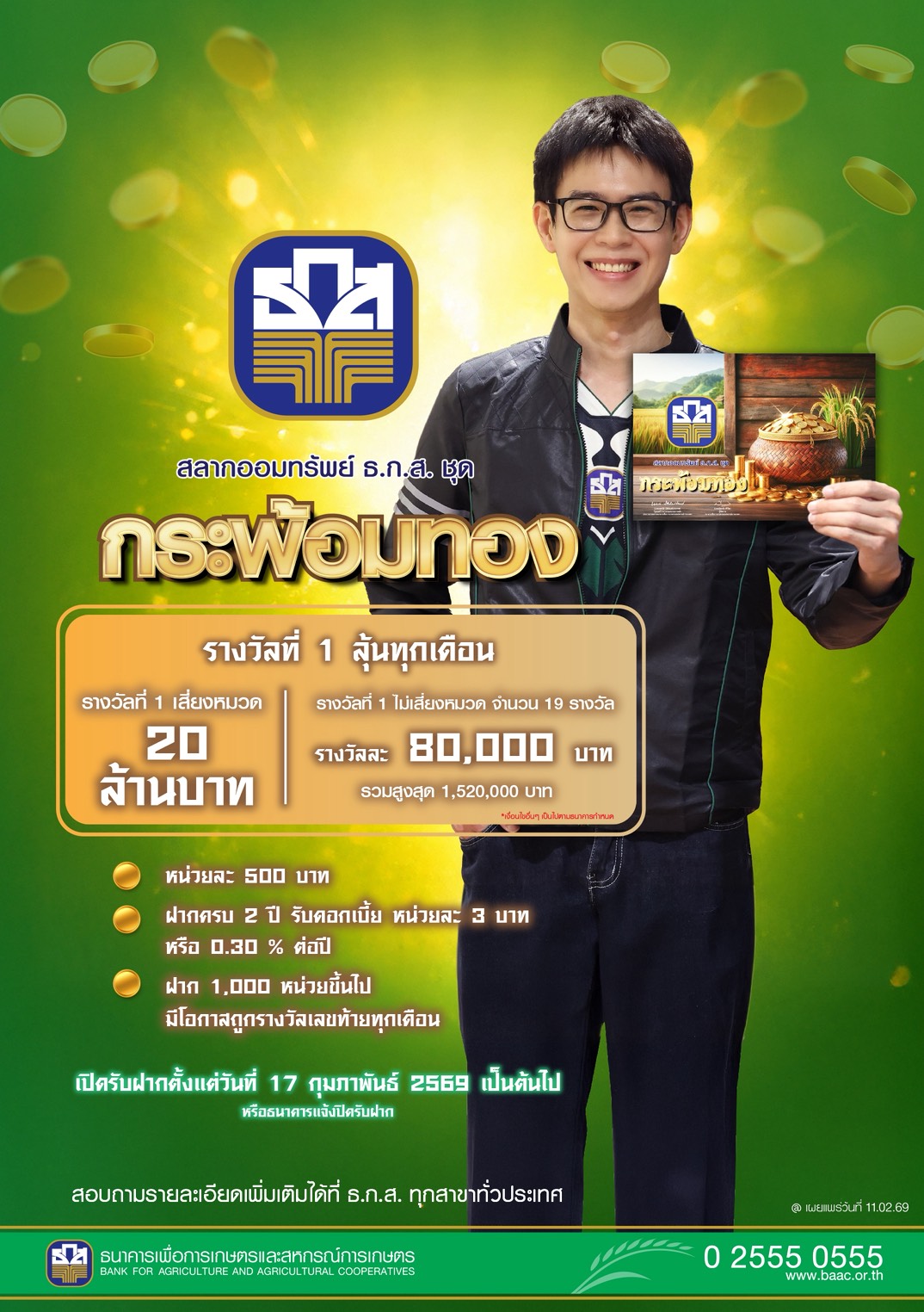 นายไพศาล หงษ์ทอง รองผู้จัดการธนาคารเพื่อการเกษตรและสหกรณ์การเกษตร (ธ.ก.ส.) เปิดเผยว่า ธ.ก.ส. เปิดตัวสลากออมทรัพย์ ธ.ก.ส. 2 ชุดใหม่ล่าสุด ต้อนรับเทศกาลมหามงคลตรุษจีน 2569 กับสลากออมทรัพย์ ธ.ก.ส. ชุดกระพ้อมทอง หน่วยละ 500 บาท จำนวน 200 ล้านหน่วย แบ่งเป็น 20 หมวด วงเงินรวม 100,000 ล้านบาท อายุการรับฝาก 2 ปี เมื่อฝากครบกำหนด จะได้รับดอกเบี้ยหน่วยละ 3 บาท คิดเป็นอัตราดอกเบี้ยร้อยละ 0.30 ต่อปี พร้อมลุ้นรางวัลที่ 1 มูลค่า 20 ล้านบาท และรางวัลอื่นๆ ทุกเดือน รวม 24 ครั้ง