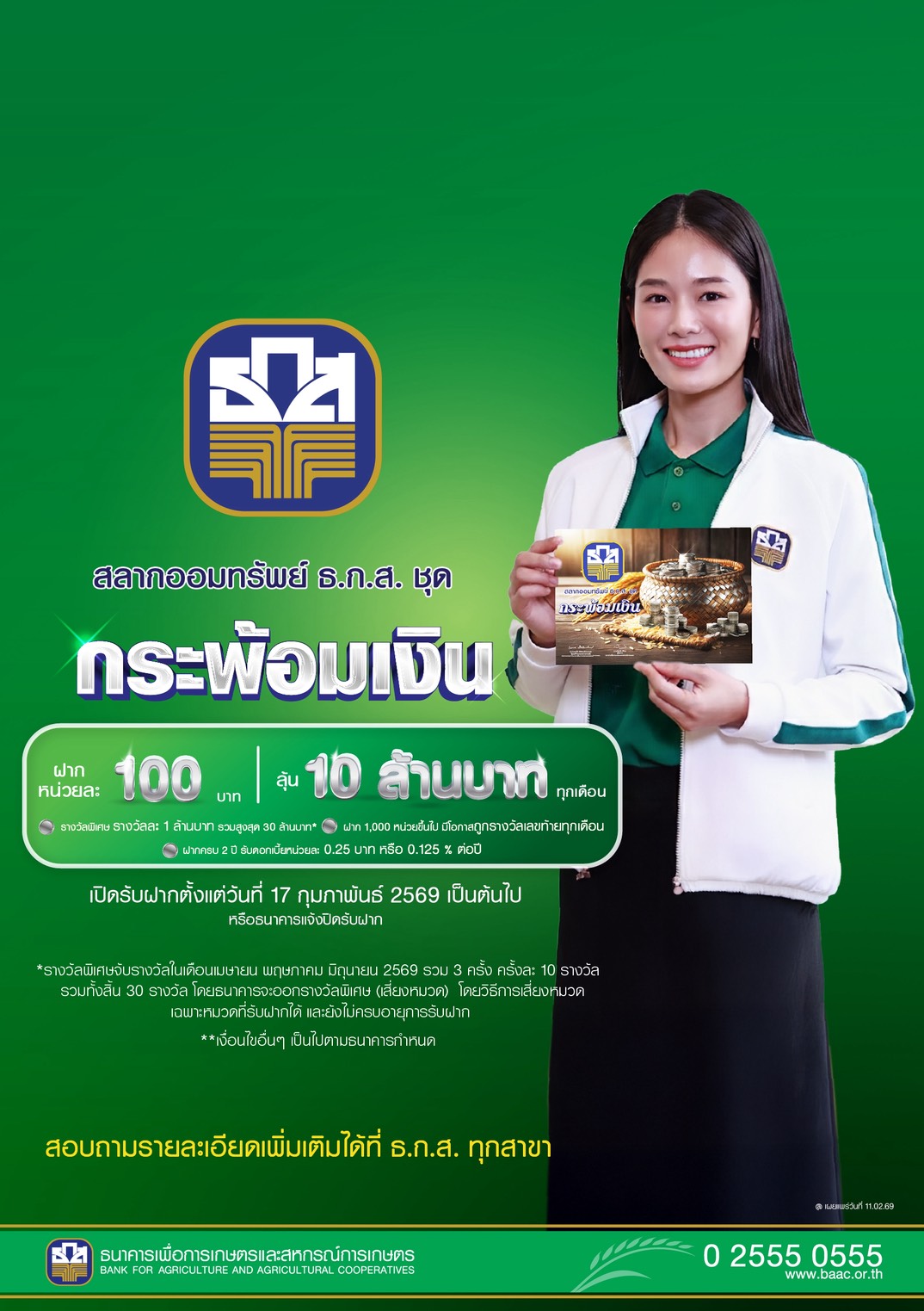 ธ.ก.ส. เปิดตัวซีรีส์ “สลากออมทรัพย์ ธ.ก.ส.” รับความรวยในเทศกาลตรุษจีน 2569 ในชุด “กระพ้อมทอง” และ “กระพ้อมเงิน” ลุ้นโชคใหญ่ และรางวัลอื่นรวม 24 ครั้ง ฝากครบ 2 ปี รับดอกเบี้ย ขณะที่เงินรางวัลได้รับการยกเว้นภาษีสำหรับบุคคลธรรมดา เปิดรับฝากตั้งแต่วันนี้เป็นต้นไป ผ่านแอปพลิเคชัน BAAC Mobile และ ธ.ก.ส. ทุกสาขา