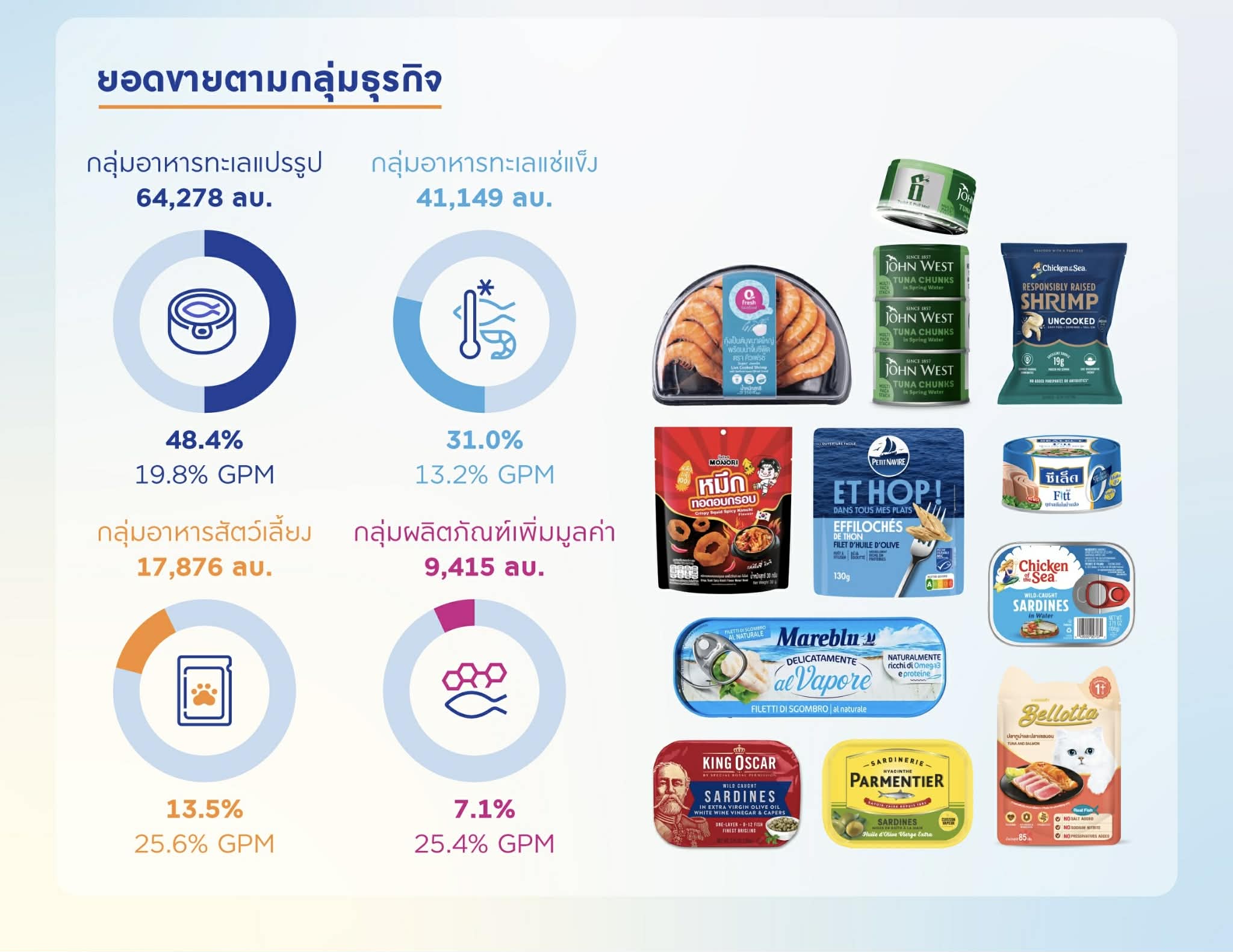 ทั้งนี้ กลุ่มผลิตภัณฑ์อาหารทะเลแปรรูปมีปริมาณการขายเพิ่มขึ้นในยุโรป สหรัฐฯ แคนาดา และไทย แต่ยอดขายลดลง 1.8% เมื่อเทียบกับปีก่อน จากราคาขายเฉลี่ยที่ลดลง โดยเฉพาะอย่างยิ่งในยุโรป ขณะที่กลุ่มผลิตภัณฑ์อาหารทะเลแช่แข็ง ยอดขายเติบโต 3.4% และปริมาณการขายเพิ่มขึ้น 5.6% เมื่อเทียบกับปีก่อน จากการปรับราคาที่เกี่ยวเนื่องกับภาษีนำเข้าของสหรัฐฯ และผลการดำเนินงานที่แข็งแกร่งของธุรกิจอาหารสัตว์น้ำและสัตว์บก โดยมีอัตรากำไรขั้นต้นระดับสูงสุดเป็นประวัติการณ์ที่ 14.5% จากราคาขายที่ปรับตัวสูงขึ้นตามภาษีนำเข้าของสหรัฐฯ