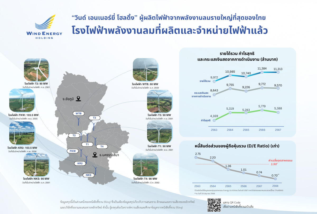 ทั้งนี้ บริษัทฯ ยังคงแสดงศักยภาพการดำเนินงานที่แข็งแกร่งอย่างต่อเนื่อง โดยในปี 2567 บริษัทฯ มีรายได้รวม 11,313 ล้านบาท และกำไรสุทธิ 5,388 ล้านบาท ซึ่งบริษัทฯ คาดว่าจะรักษารายได้รวมที่แข็งแกร่งดังกล่าวต่อเนื่องเป็นปีที่ 6 โดยมีรายได้รวมงวด 6 เดือน ปี 2568 อยู่ที่ 5,198 ล้านบาท เพิ่มขึ้นร้อยละ 2.68 จากช่วงเดียวกันของปีก่อน ในขณะที่อัตราส่วนหนี้สินต่อทุน (D/E Ratio) ] ลดลงต่อเนื่องอยู่ในระดับต่ำที่ 0.70 เท่า จาก 0.74 เท่า เมื่อสิ้นปี 2567 ซึ่งต่ำกว่าค่าเฉลี่ยของอุตสาหกรรมที่ 1.50 เท่า และไม่เคยมีประวัติผิดนัดชำระหนี้ โดยผลการดำเนินงานดังกล่าวเป็นผลจากปริมาณการผลิตไฟฟ้าที่สูงกว่าเป้าหมาย เนื่องจากความเร็วลมเฉลี่ยอยู่ในระดับสูงใกล้เคียงกับปีก่อนหน้า รวมถึงความพร้อมใช้งานของกังหันลมที่อยู่ในระดับสูงอย่างต่อเนื่องตลอดทั้งปี