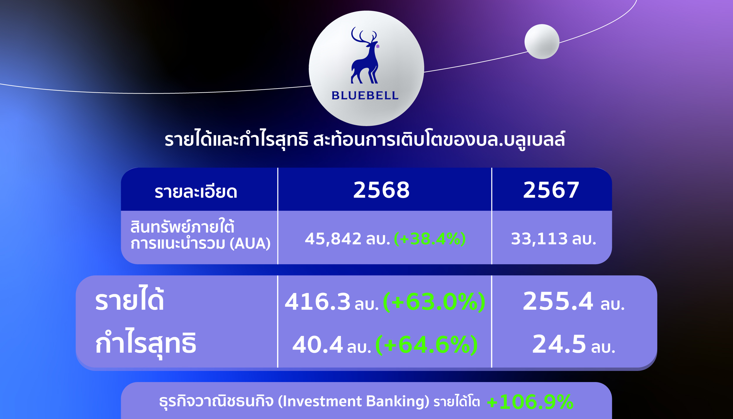 บริษัทหลักทรัพย์ บลูเบลล์ จำกัด (บลูเบลล์) เปิดเผยผลการดำเนินงานในปี 2568 เติบโตจากปี 2567 อย่างแข็งแกร่งทุกมิติ โดยสินทรัพย์ภายใต้การแนะนำรวม (AUA) เพิ่มขึ้น 38.4% อยู่ที่ 45,842 ล้านบาท รายได้รวม 416.3 ล้านบาท เติบโต 63.0% กำไรสุทธิ 40.4 ล้านบาท เพิ่มขึ้น 64.6% สะท้อนศักยภาพและความแข็งแกร่งของธุรกิจท่ามกลางภาวะตลาดผันผวน