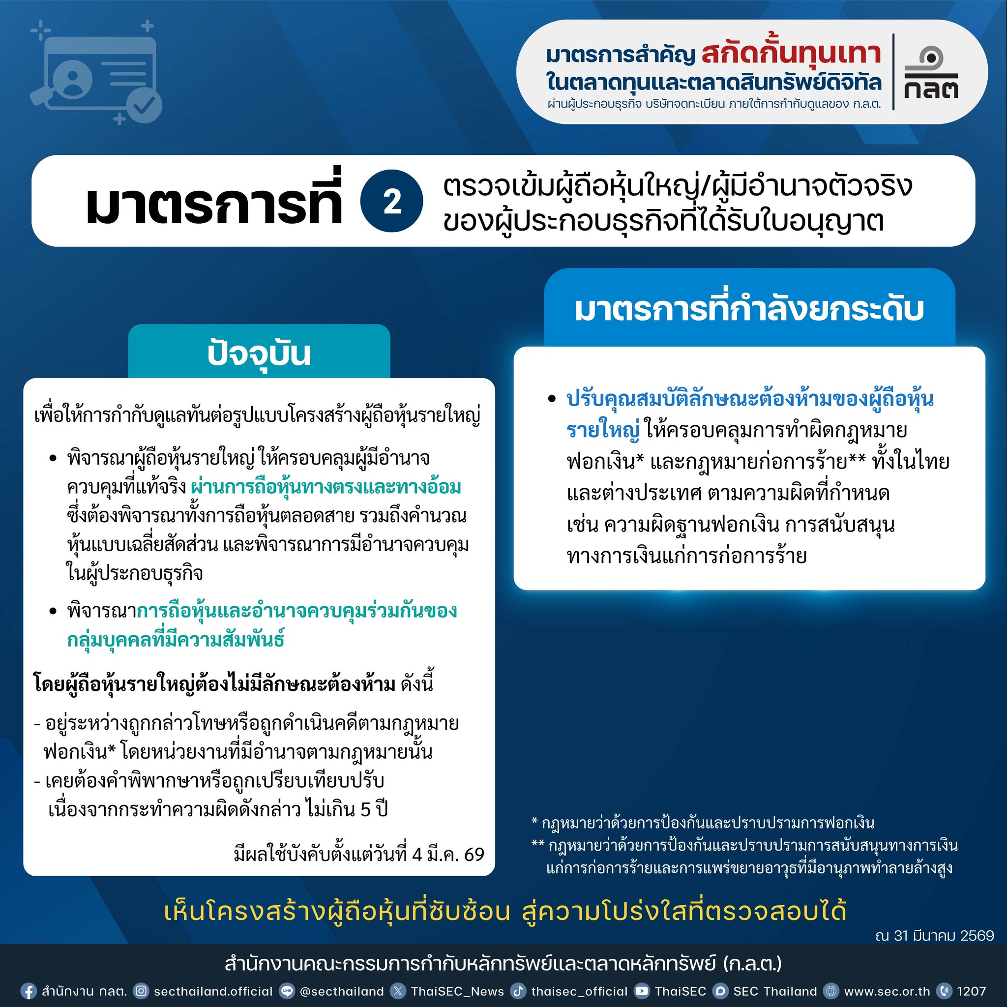 2. ตรวจเข้มผู้ถือหุ้นใหญ่ ผู้มีอำนาจตัวจริงของผู้ประกอบธุรกิจที่ได้รับใบอนุญาต ปัจจุบัน ก.ล.ต. มีการกำกับดูแลโครงสร้างผู้ถือหุ้นรายใหญ่ เช่น การพิจารณาผู้ถือหุ้นรายใหญ่ให้ครอบคลุมผู้มีอำนาจควบคุมที่แท้จริงผ่านการถือหุ้นทางตรงและทางอ้อม รวมทั้งการที่ผู้ถือหุ้นรายใหญ่ต้องไม่มีลักษณะต้องห้าม เช่น อยู่ระหว่างถูกกล่าวโทษหรือถูกดำเนินคดีตามกฎหมายฟอกเงิน เป็นต้น ทั้งนี้ เพื่อให้การกำกับเท่าทันต่อรูปแบบโครงสร้างผู้ถือหุ้นที่ซับซ้อนมากขึ้น รวมถึงสะท้อนผู้มีอำนาจควบคุมที่แท้จริงได้ ก.ล.ต. จึงจะมีการปรับปรุงให้ผู้ถือหุ้นรายใหญ่ครอบคลุมถึงผู้ให้แหล่งเงินทุนแก่ผู้ถือหุ้นรายใหญ่ และปรับลักษณะต้องห้ามให้ครอบคลุมการทำผิดกฎหมายฟอกเงินและกฎหมายการก่อการร้ายทั้งในไทยและต่างประเทศ